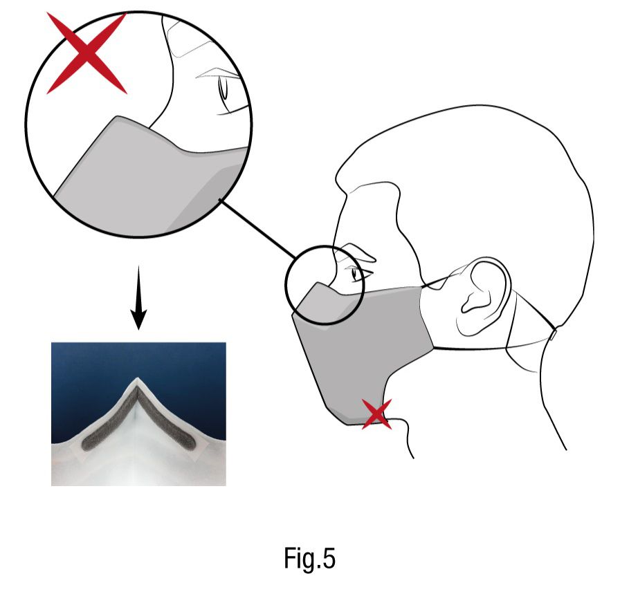 Put the mask on your face to cover your nose and chin (Fig. 1). Leave a space about the size of a finger between the mask and the underside of the chin for ventilation. The mask should be placed flat, halfway up on your nose (Fig. 4).